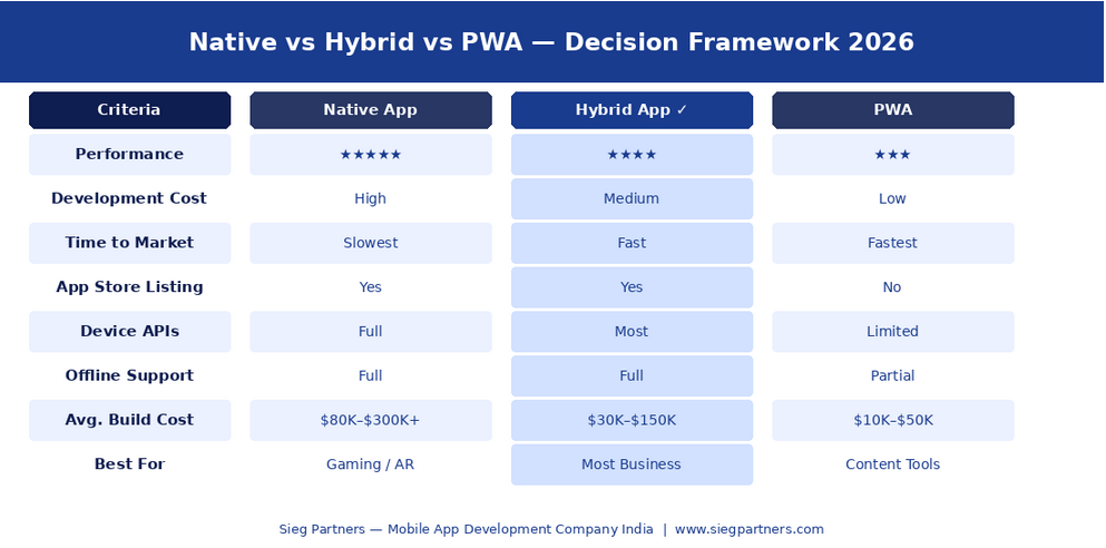 KMP has emerged as one of the most interesting framework stories in 2026. Rather than replacing the UI layer, KMP allows teams to share business logic, networking, and data management code across iOS and Android while keeping native UI on each platform. This gives the code-sharing benefits of hybrid with the UI flexibility of native — at the cost of higher architectural complexity. Sieg Partners recommends KMP for complex enterprise apps where performance is critical and the team has strong Kotlin expertise.
